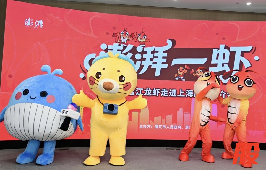 推介会上,潜江龙虾吉祥物“潜潜”“江江”与澎湃新闻吉祥物“澎澎”“湃湃”合影。